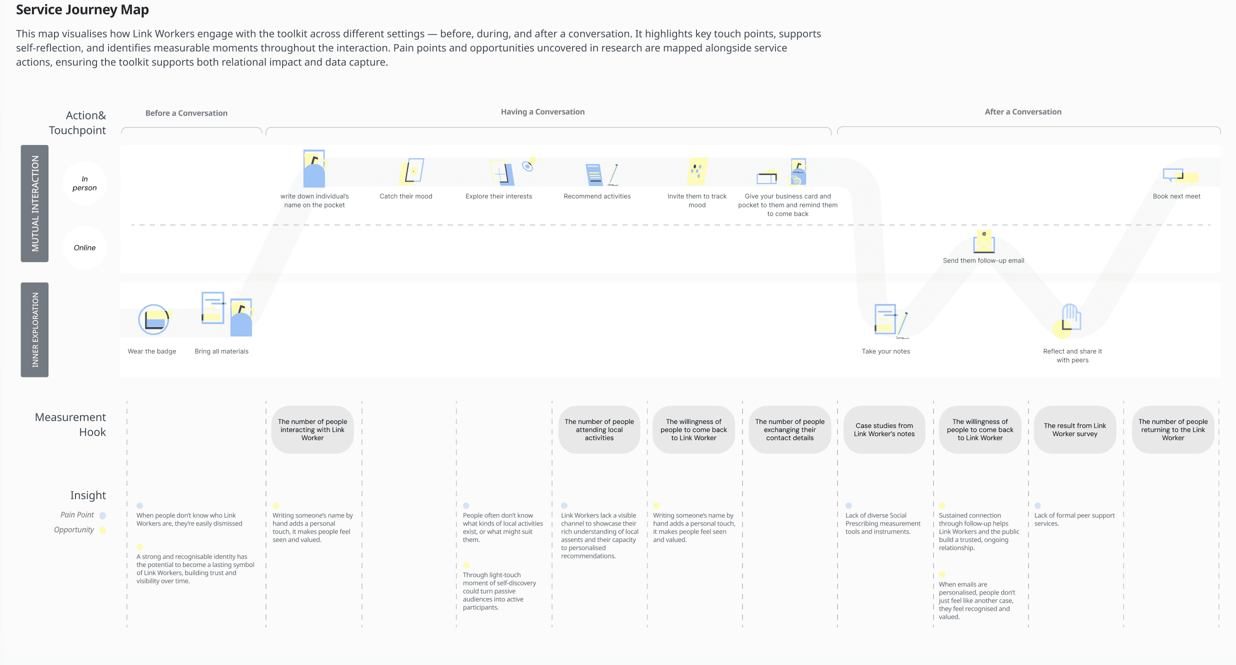 The toolkit is designed for community-facing settings(i.e. local events, public spaces, everyday encounters) where Link Workers can reach people who consider themselves healthy, or who are only beginning to notice something is off, long before a GP visit becomes necessary. At its core, the toolkit places Link Workers at the main user of the entire service journey: