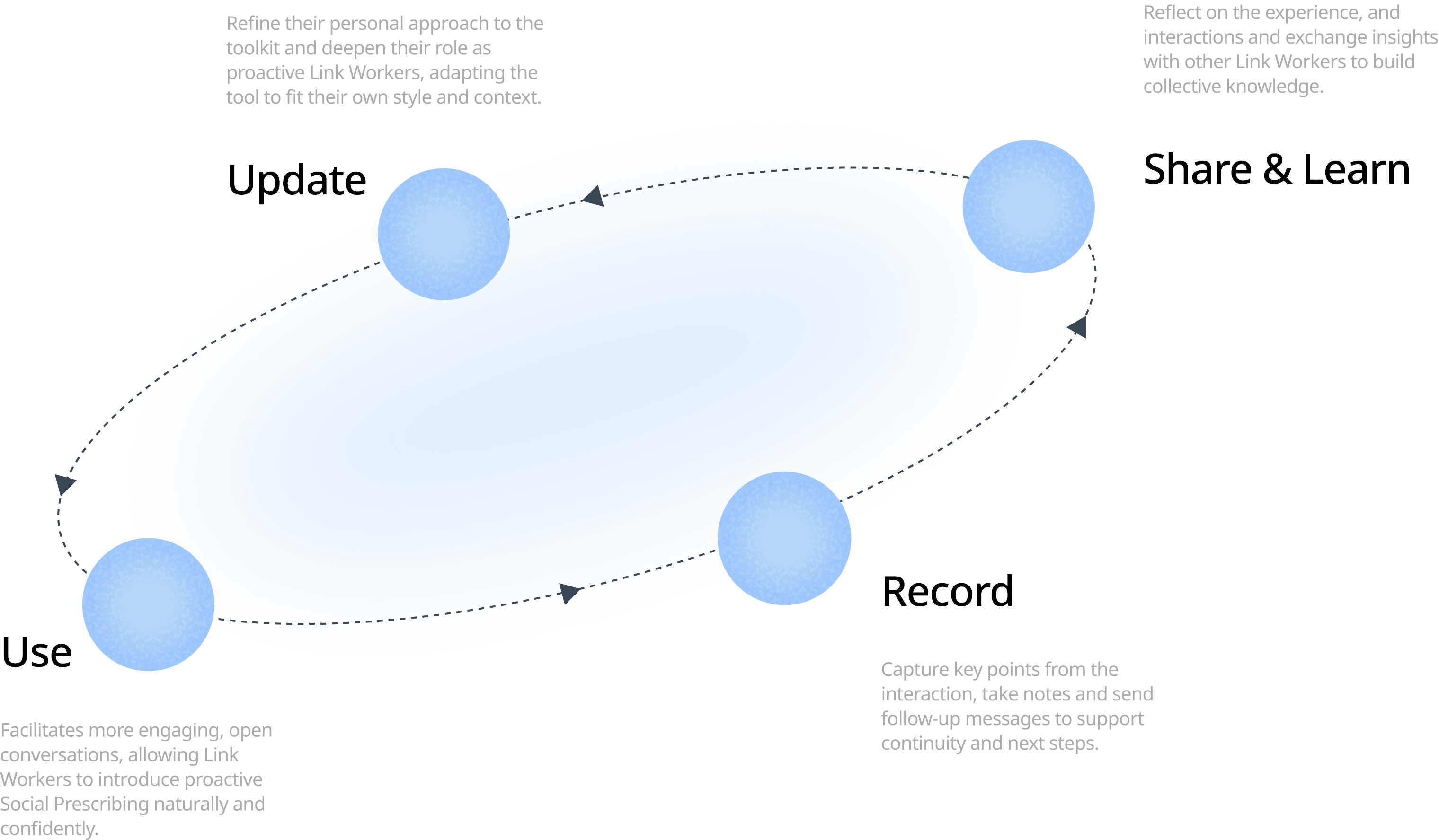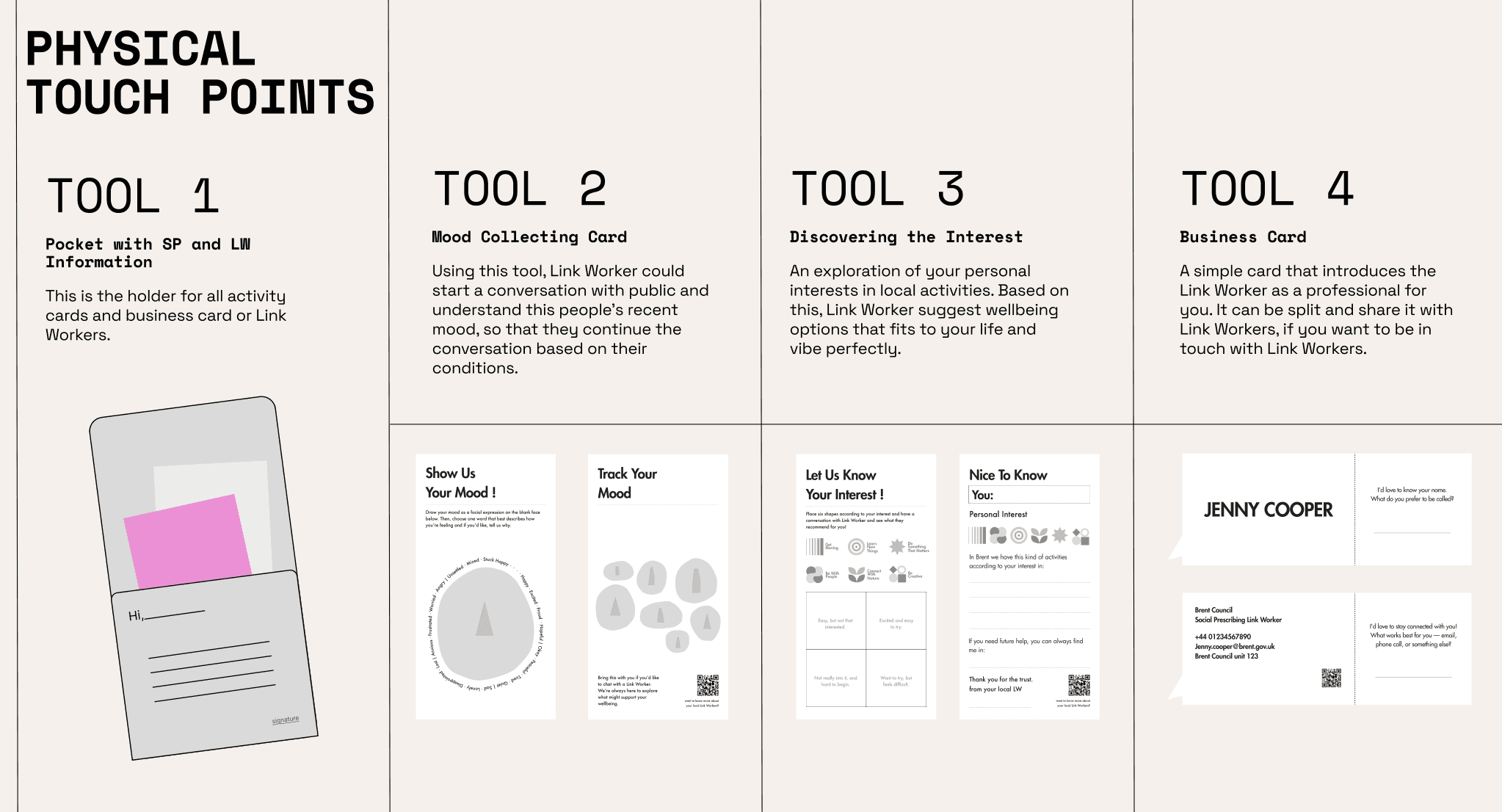 Working closely with Brent Council's Social Prescribing pilot team, we got a chance to talk deeply with them, especially Link Workers in the team, to understand their current working barriers. Currently, Link Workers rely heavily on traditional approaches, primarily measuring shifts in patients’ wellbeing after interventions, sending flyers to introduce themselves and community activities. They mentioned about those activities is not good at building trust and providing creative engagement with public, so that people can’t remember this service well. Meanwhile, they can’t recognise they are Link Worker, since there is not visible signals to show their identity.