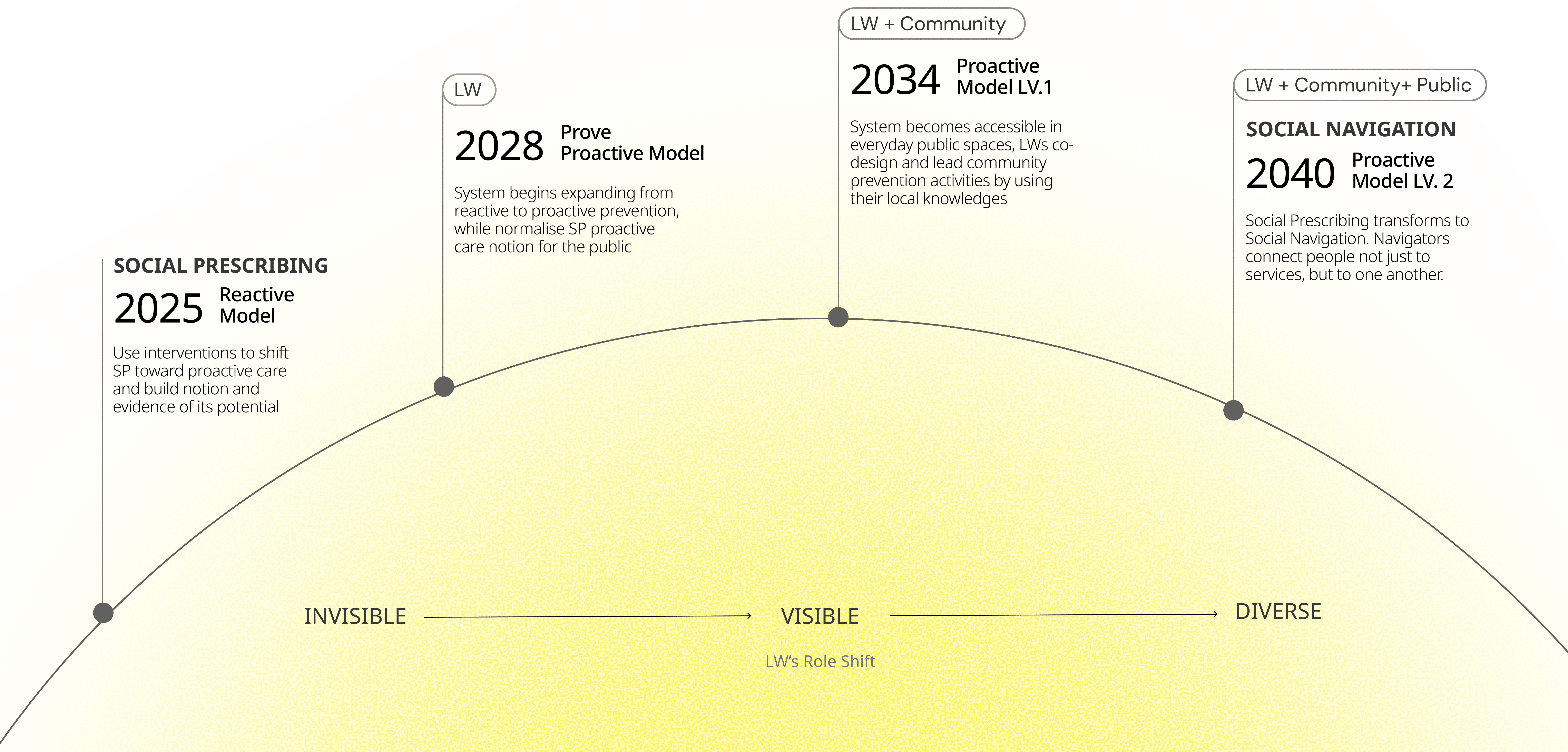 Beginning in 2025, Link Workers start moving beyond clinical settings, using practical tools to initiate proactive conversations in community spaces. By 2028, they become recognised, visible figures in local communities, trusted not just by patients but by communities. By 2040, Social Prescribing matures into Social Navigation: preventive care embedded into everyday life, delivered by a new generation of frontline professionals.