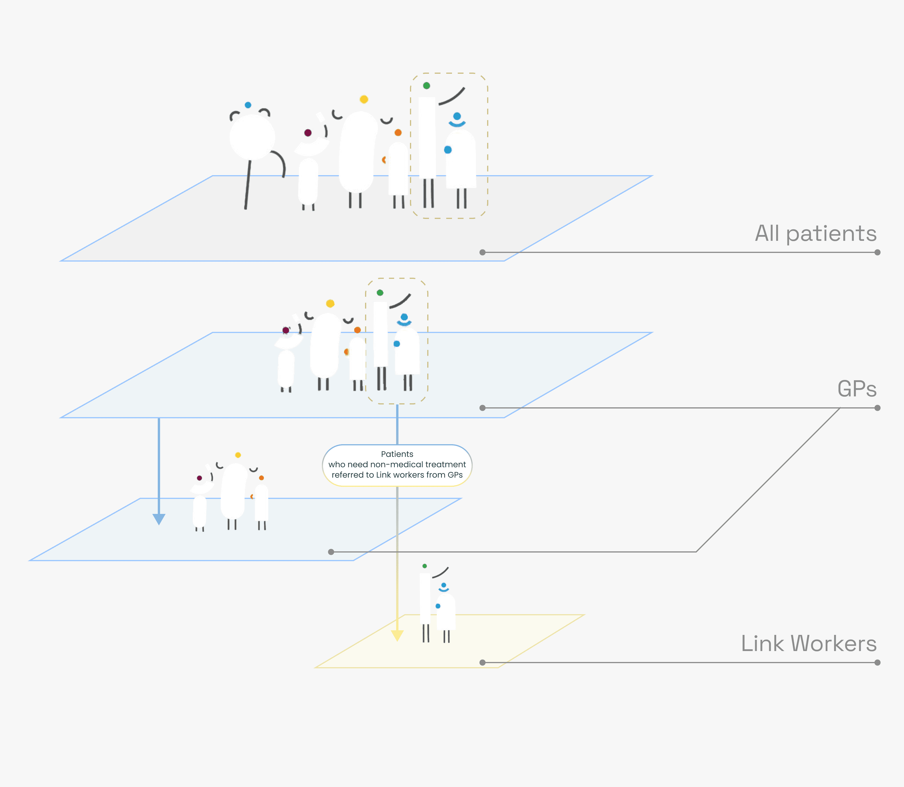 Link Workers, patients, GPs, and gov stakeholders each carry distinct needs, pressures, and degrees of power. This shifted the project's lens from user satisfaction toward public health service equity.