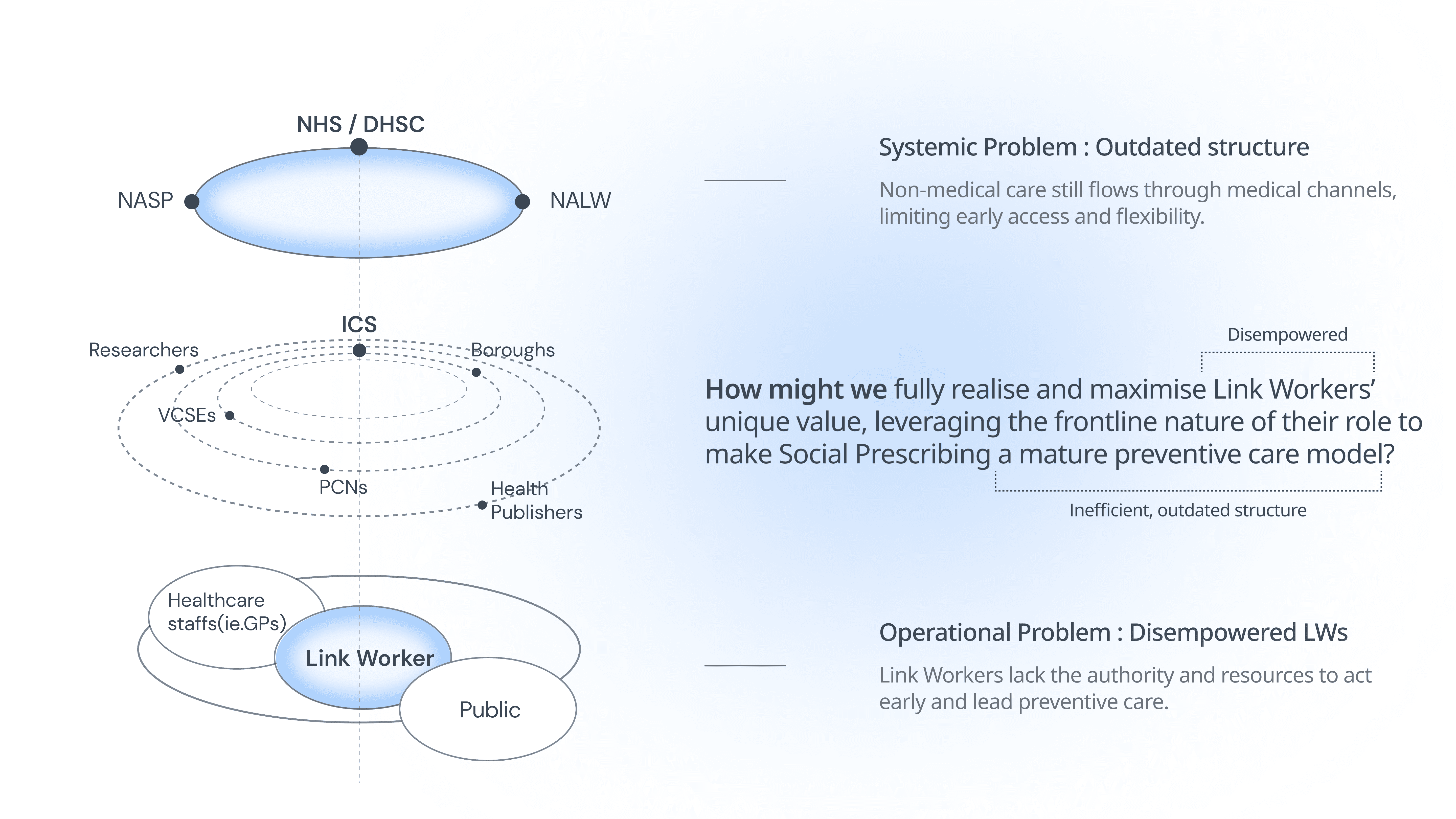 So we asked: How might we fully realise and maximise Link Workers’ unique value, leveraging the frontline nature of their role to make Social Prescribing a mature preventive care model?