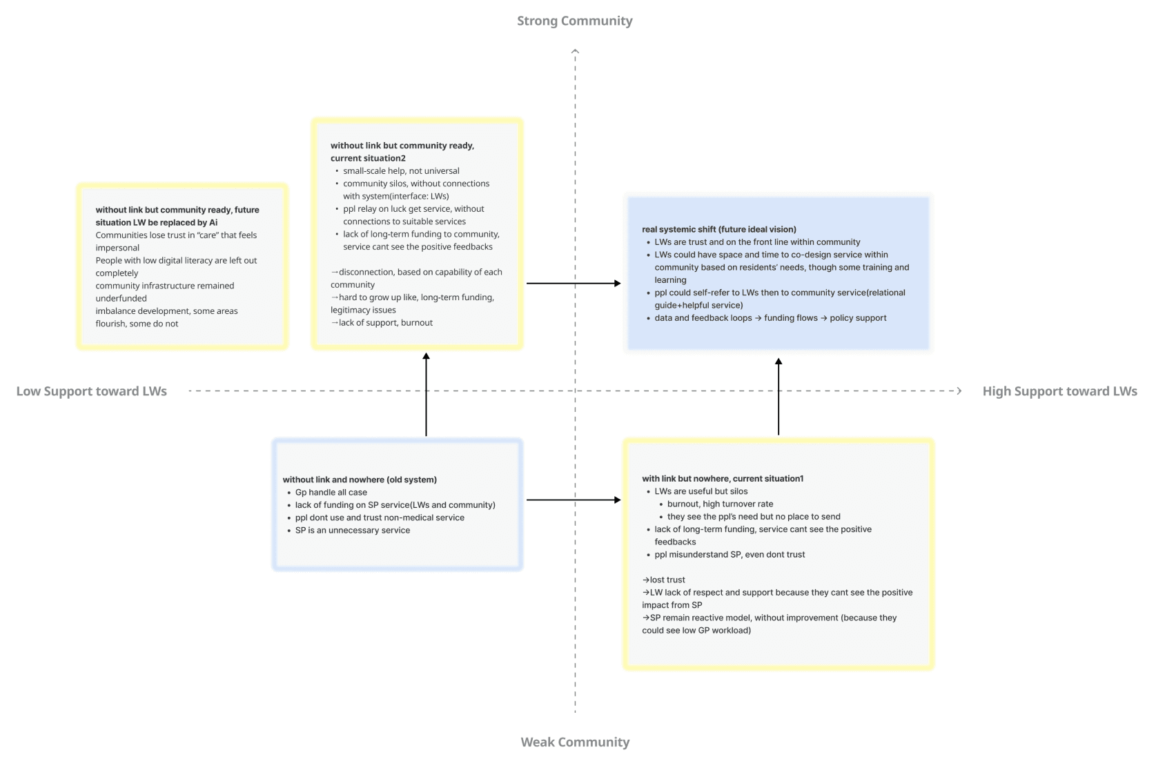 After understanding how Social Prescribing actually operates day-to-day by completing 1 shadowing session with Link Worker, 3 community site visits across London (Tower Hamlets and Brent Council), and 4 interviews with frontline staff (Within/Outside the NHS organisation). Meanwhile, I reviewed the NHS policy documents and secondary research(i.e. University of Oxford studies led by Stephanie Tierney). When I mapped the as-is service blueprint to visualise the current operating model, it showed a clear gap: Link Workers have the potential to fully create their values, but structural barriers were limiting what they could actually deliver.