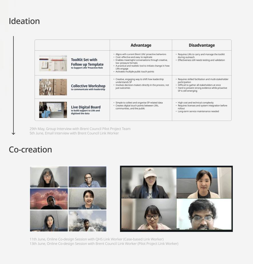 I partnered with Brent Council's Adult Healthcare Social Prescribing pilot team, also worked with a diverse group of staff, experts, policy makers (The King's Fund) and researchers (NASP), aligning on the same vision, learning from them who were trying to make this vision work, and co-designing solutions with them together that could actually work in practice.