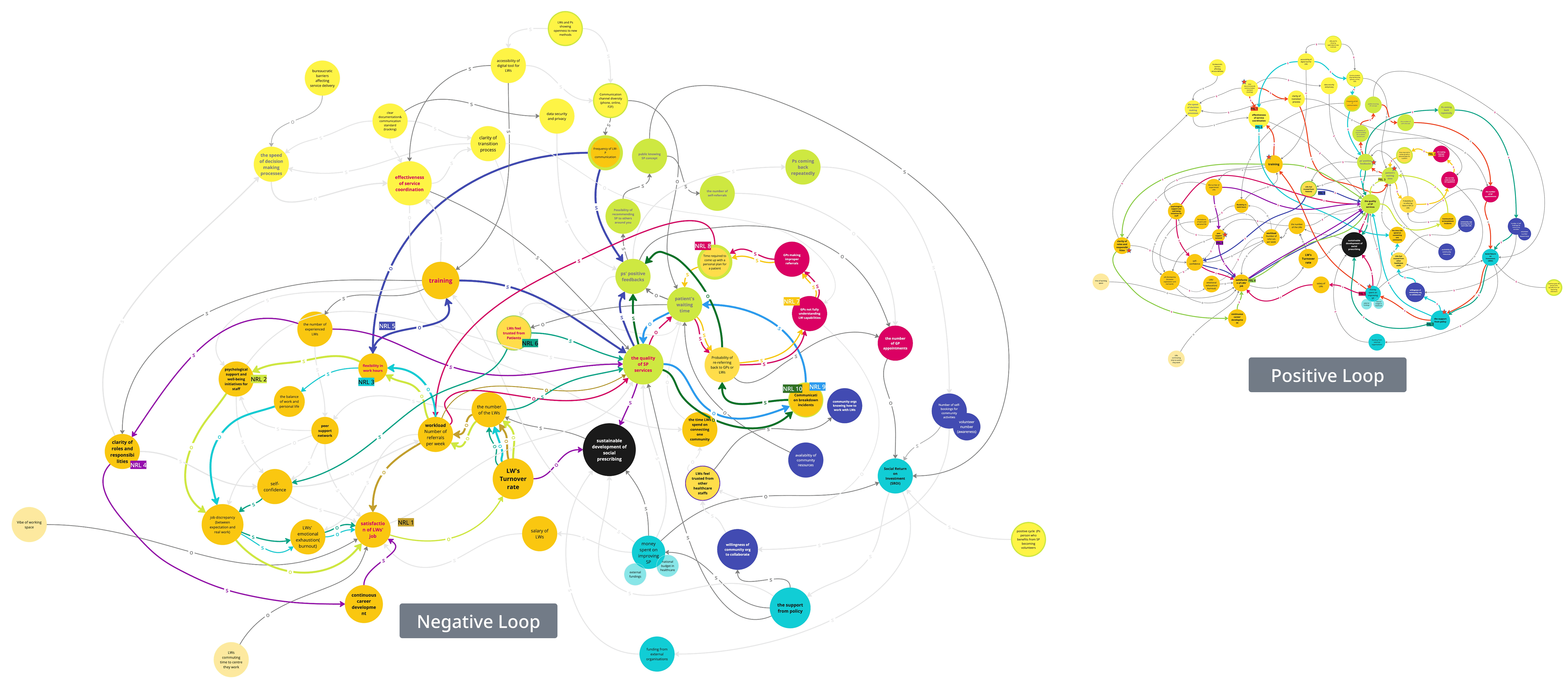 From the outset, we approached SP as a complex social system involving actors at multiple levels — from NHS policy and local councils to frontline Primary Care Networks (PCNs), Link Workers and community organisations. To navigate this, we used Systems Thinking and Mapping (Figure3. System thinking map) to understand both macro and micro dynamics. We used this method to map both positive and negative feedback loops across the Social Prescribing system, revealing how GPs, Link Workers, patients, and councils interact. It exposed both enabling structures and systemic barriers.