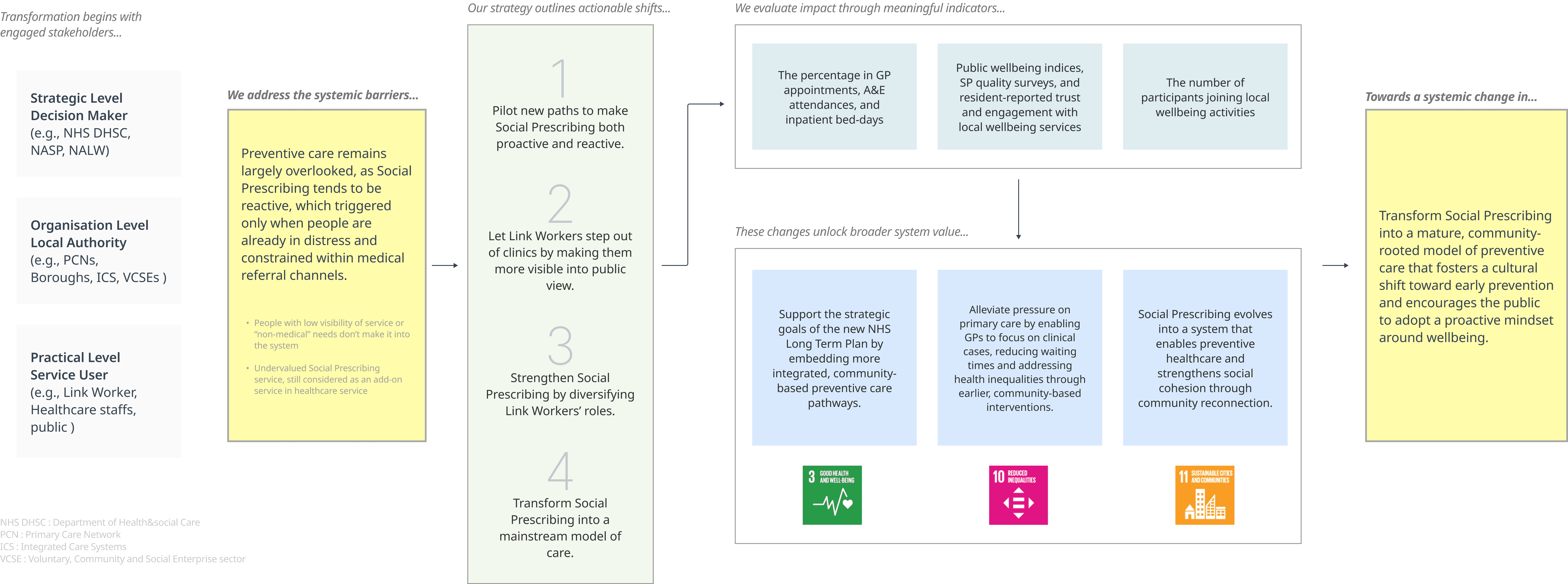 Our strategic outcome is a long-term vision where Social Prescribing evolves into Social Navigation by 2040, fully embedding preventive care into everyday life. The reason we prefer to change the name of this service is based on our survey toward LWs, patients and the general public. Over 80% of them will misunderstand this service because of “prescribing” this word if they are the first to hear about it.