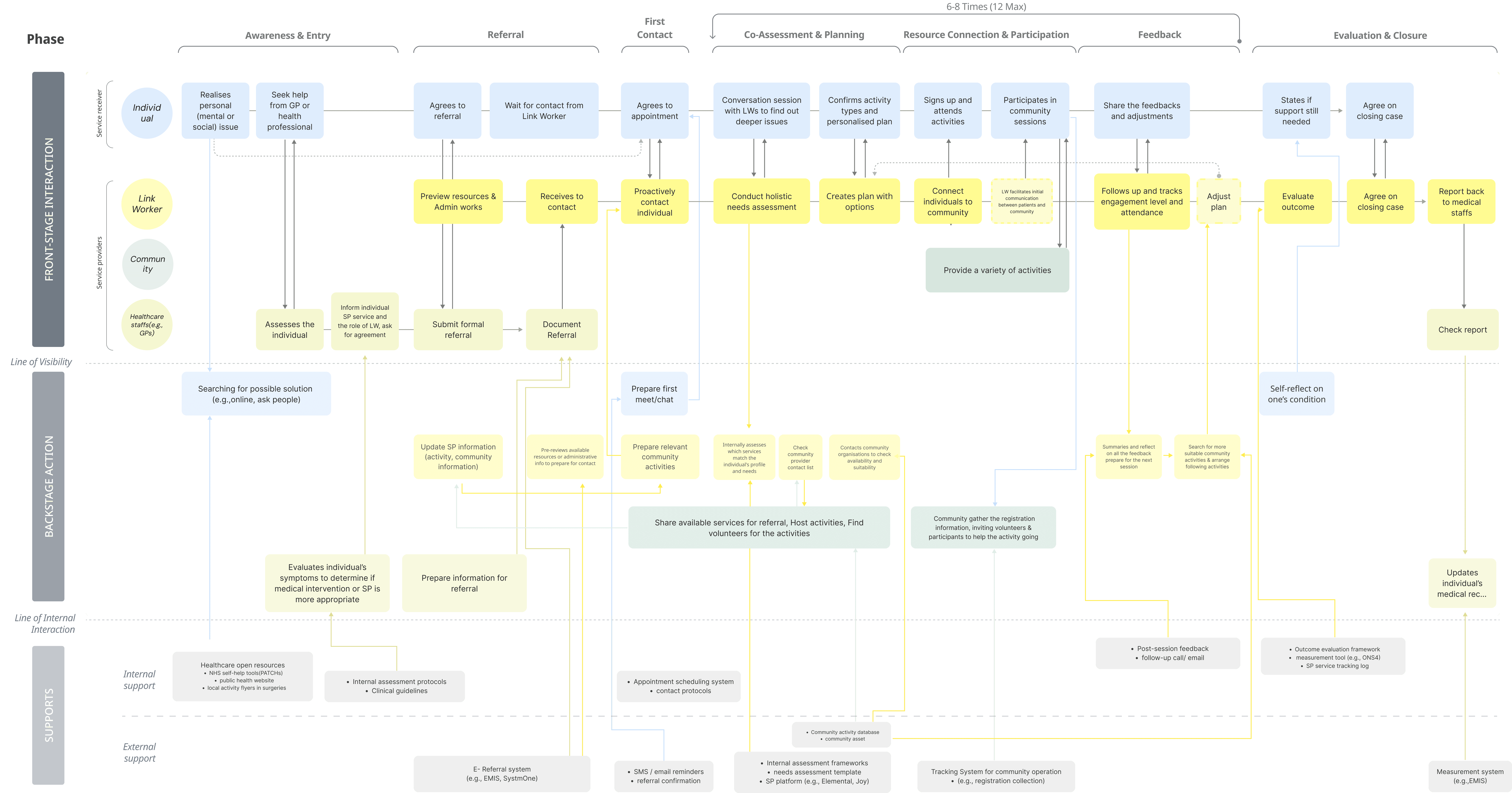 >Service Blueprinting: Synthesising ten months of SP delivery into a single service flow, revealing that LWs are the key relational node connecting people across clinical and non-clinical support. (Figure2. Service blueprint)